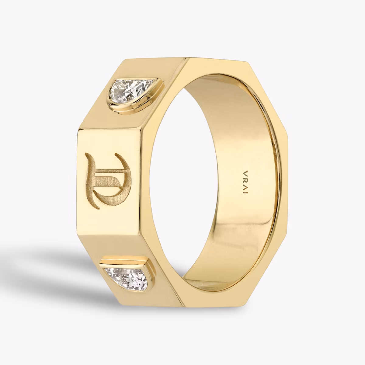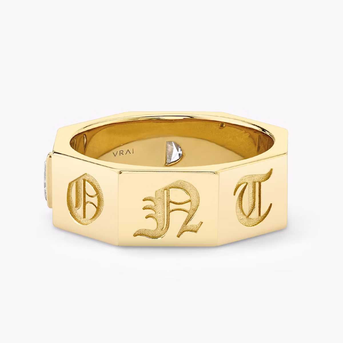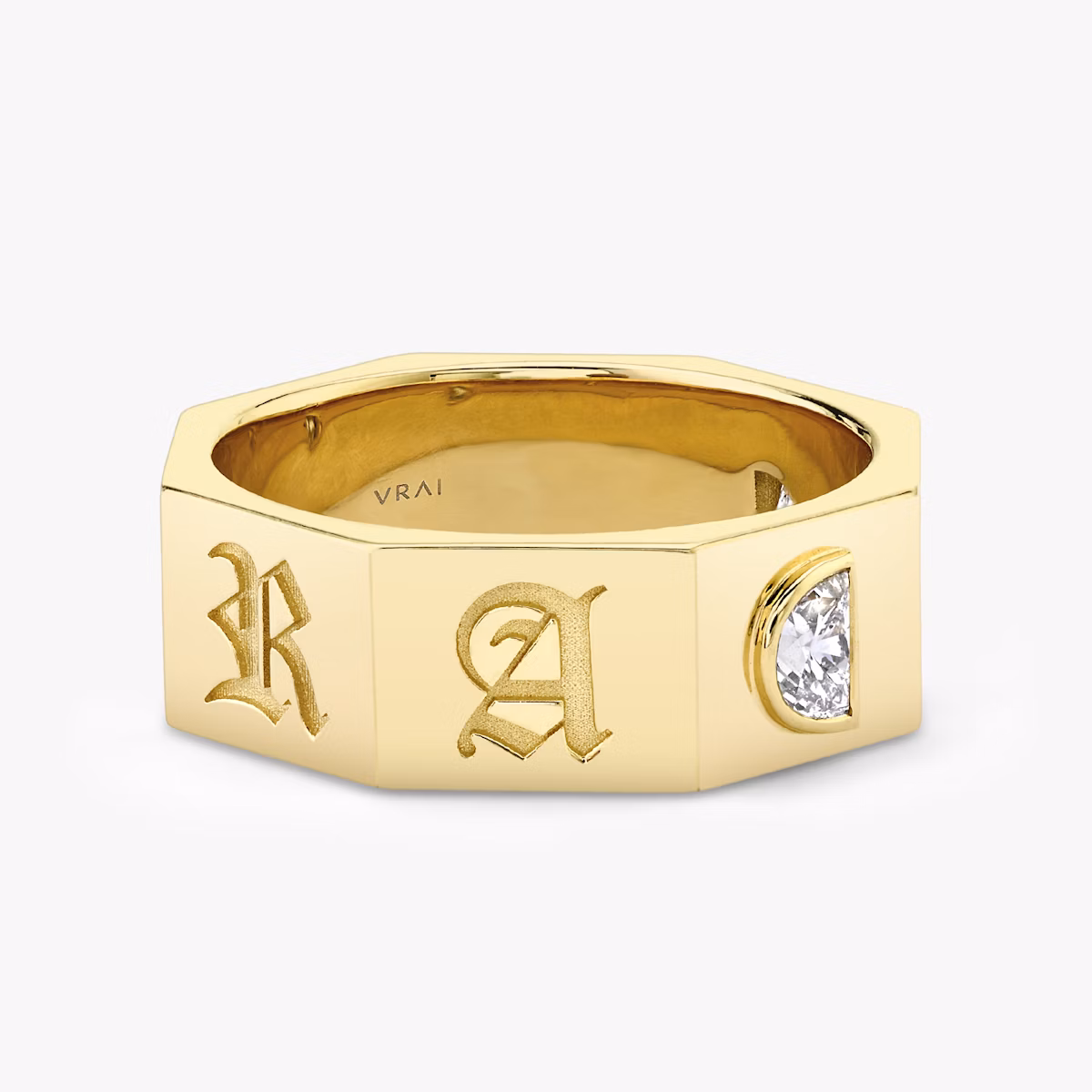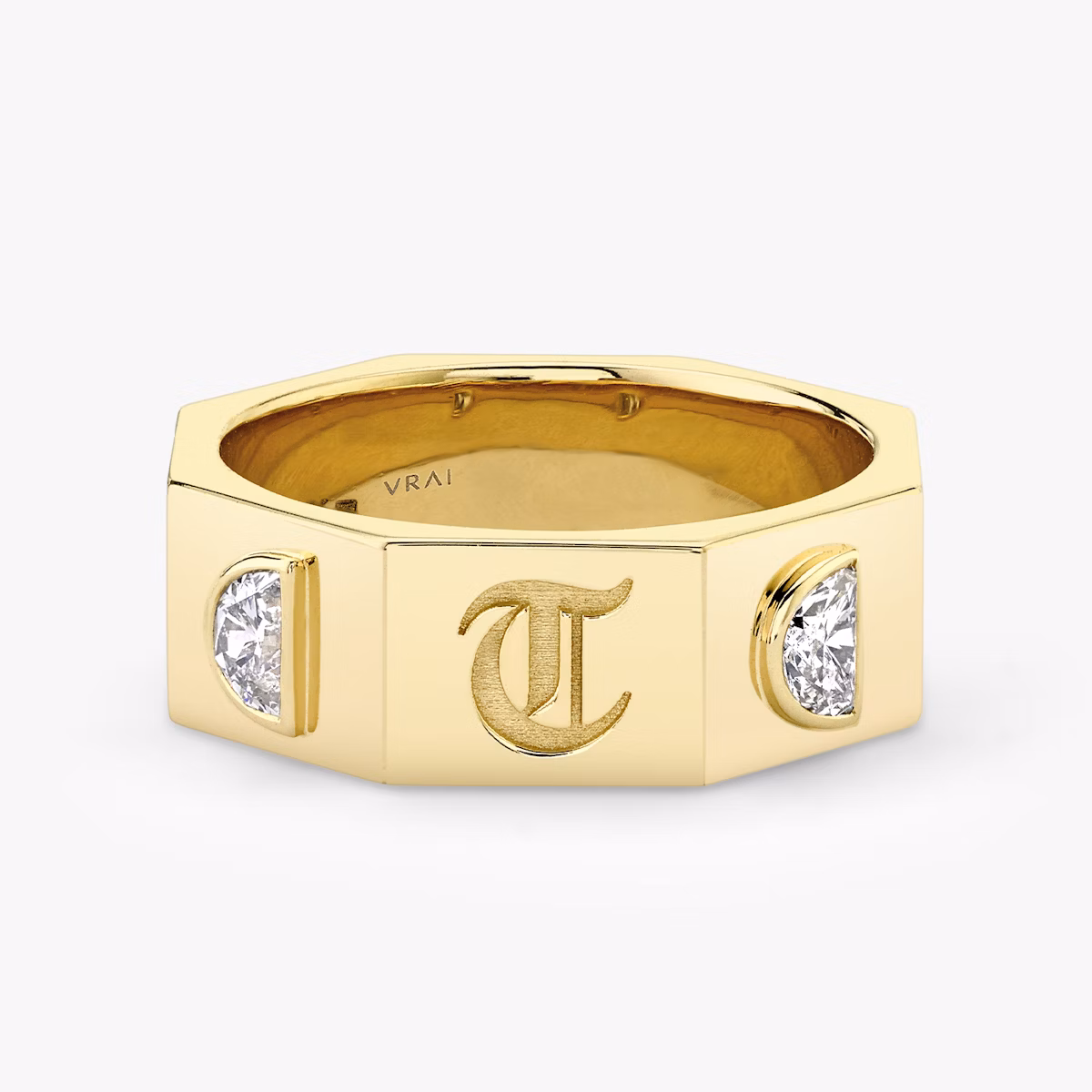 Honor your promises with our Contract Ring, a 14k yellow gold band with an inscription and two half-moon VRAI created diamonds. Its dramatic design underlines the importance behind life’s greatest moments.